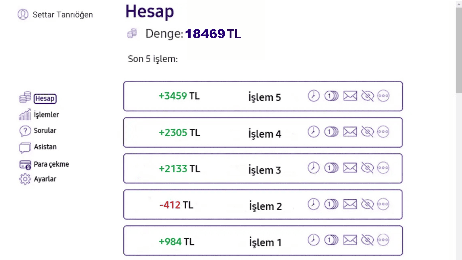 Size hikâyemi anlatacağım. Platforma kaydoldum, beni aradılar ve her şeyi anlattılar. Para yatırmak için hiç param yoktu, risk almaya karar verdim ve bir arkadaşımdan 10000 TL borç aldım. Sonra kartıma koydum ve para yatırdım, tabii ki ilk kez yaptığımda korktum. Hesaba göz kulak oldum ve 8-9 gün sonra bakiyede zaten 29.000 TLvardı. Hemen yarısını karttan çektim, 10000 TL'luk bir borcu ödedim ve 20.000 TL'yu kenara ayırdım. Paranın geri kalanını yatırım yapmak için platformda tuttum. Şu anda 31.000 TL ve bugün yarısını çekiyorum.